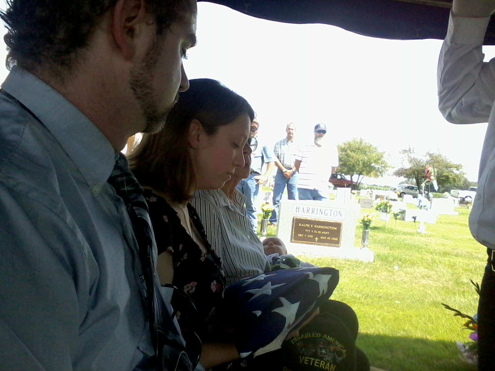 And then our daughter was handed the flag that stood beside him throughout the funeral. Our son-in-law and His mother sit beside, with his mother holding our grandchild. His favorite hat lay in our girl’s lap. Some of His veteran friends can be seen standing at ease in the background. The Marine with the beard was to die just nine months later. The last thing the friend told his wife was that he was going to go see our Veteran. 😥