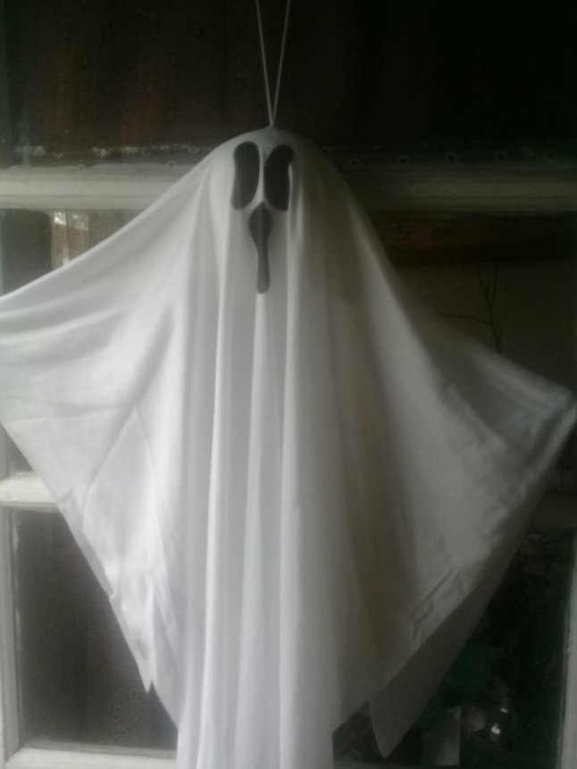 I want to iterate (sp?) that I don’t celebrate Halloween. However, once in a while I find a cute item that I just can’t resist. I hung up last year’s ghostie I found at the Dollar Tree on my back door. Too cute!